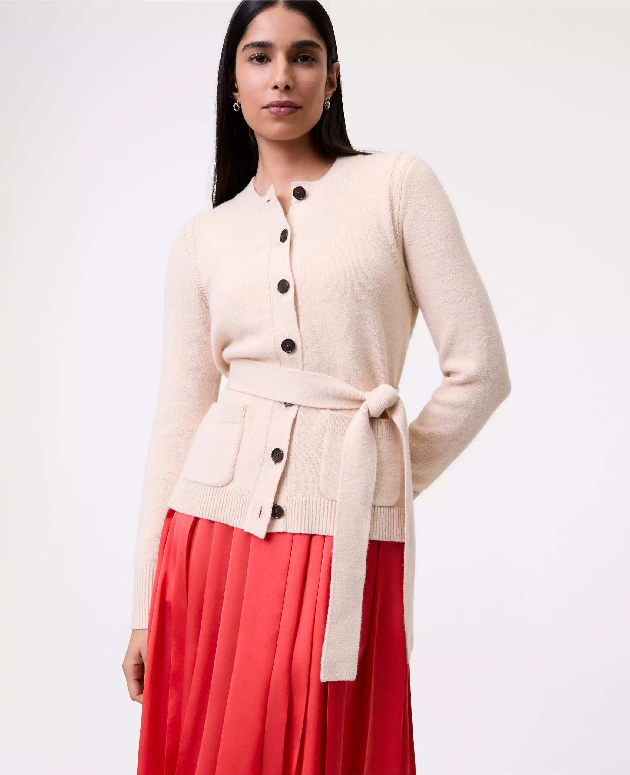 Chic and streamlined, this belted cardigan works well on its own or styled over a simple tank. Ribbed crew neck, cuffs and hem. Long sleeves. Front button closures. Patch pockets. Functional waist tie